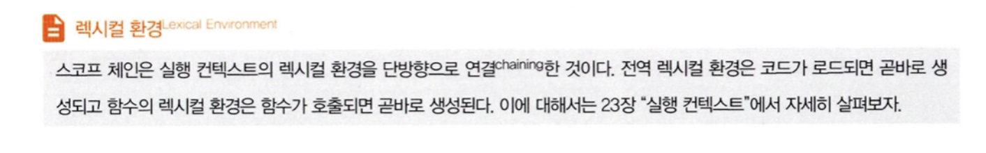 이처럼 JS 엔진은 스코프 체인을 따라 변수를 참조하는 코드의 스코프에서 시작해서 상위 스코프방향으로 이동하면서 선언된 변수를 검색한다 절대 하위 스코프로 내려가면서 식별자를 검색하는일은 절대절대 절대 존재하지않는다
