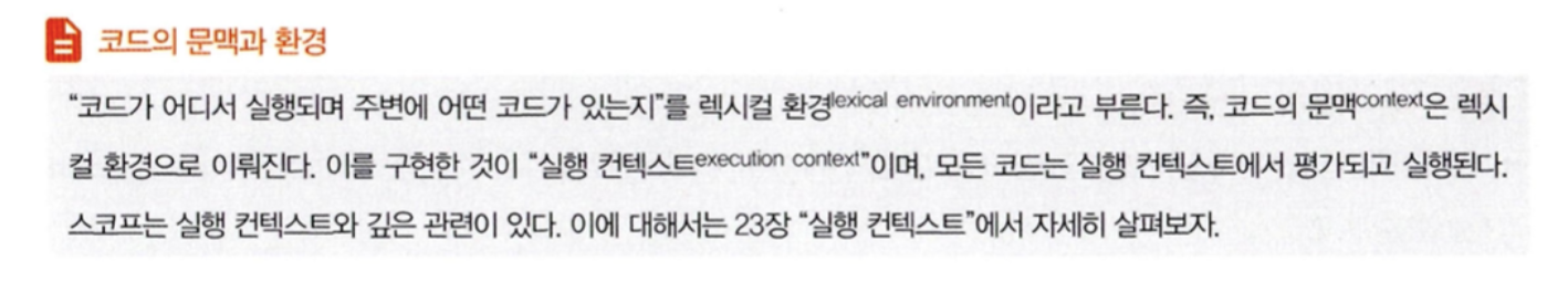 - js 엔진은 스코프를 통해 어떤 변수를 참조할것인지도 결정한다 스코프란 js 엔진이 식별자를 검색 할때 사용하는 규칙 이라고 할수있다 js 엔진은 코드를 실행할때 코드의 문맥을 고려한다 코드가 어디서 실행되고 주변에 어떤 코드가 있는지에 따라 위 예제의 1, 2 번이 다른 결과를 만들어낸다