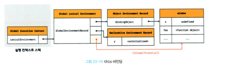 - 전역환경 레코드를 구성하는 객체 환경 레코드와 선억적 환경 레코드에는 this 바인딩이 없다 this 바인딩은 전역환경 레코드와 함수 환경 레코드에만 존재