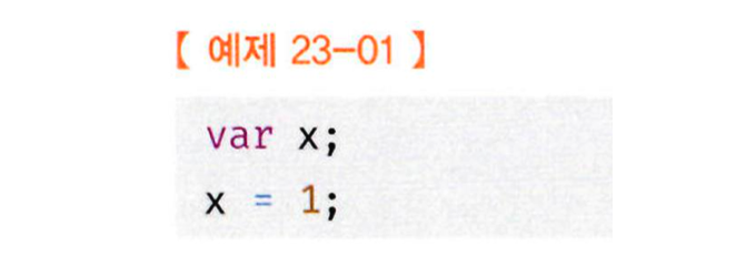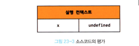 JS엔진은 위 예제를 2개의 과정으로 나누어 처리 평가 와 실행 평가 과정에서 변수 선언문 var x 를 먼저 실행 생성된 변수 식별자 x 는 실행 컨텍스트가 관리하는 스코프에 등록되고 undefined 로 초기화
