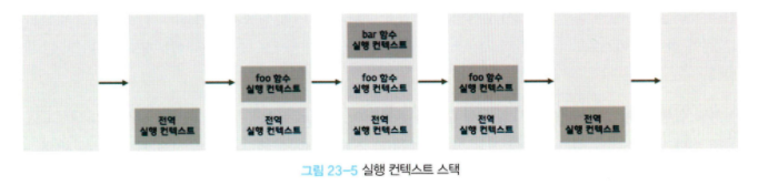 - foo 함수가 종료되면 코드의 제어권은 다시 전역코드로 이동 JS엔진은 foo함수 실행 컨텍스트를 싱행 컨텍스트스택에서 팝해서 제거 더이상 전역코드가 남아있지않으면 전역 실행 컨텍스트도 실행 컨텍스트 스택에서 팝되서 실행 컨텍스트 스택에는 아무것도 남지않는다