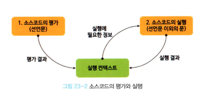 - 모든 소스코드는 실행하기전에 평가 과정을 거치고 코드를 실행하기 위한 준비를 한다 JS엔진은 소스코드를 2개의 과정 , 소스코드의 평가 와 실행 과정으로 나누어서 처리한다
