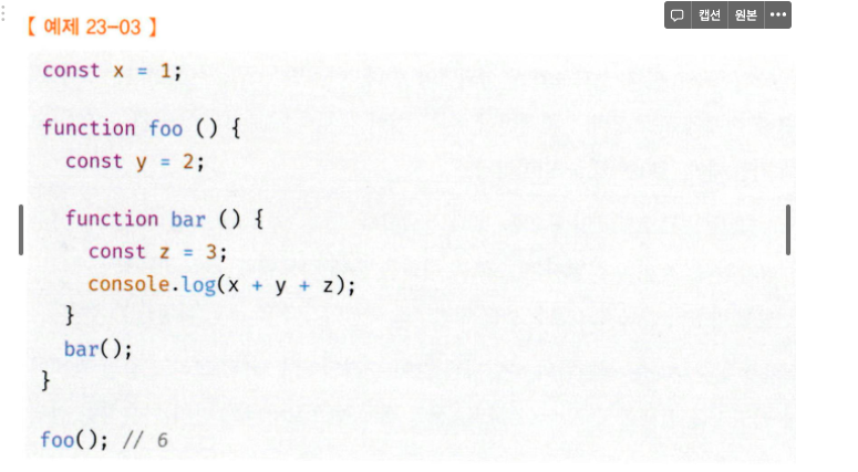 - 외부 렉시컬환경에 대한 참조는 현재 평가중인 소스코드를 포함하는 외부소스코드의 렉시컬환경 , 상위 스코프를 가리킨다 이걸로 단방향 링크드 리스트인 스코프체인을 구성