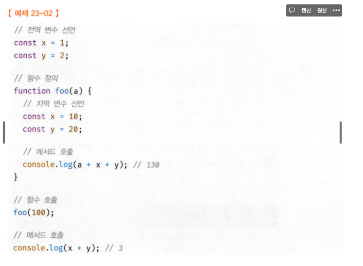 - 실행중인 실행컨텍스트는 전역 실행 컨텍스트이므로 전역 렉시컬 환경에서 식별자 x, y ,foo 를 검색하기 시작 실행중인 실행 컨텍스트의 렉시컬 환경에서 식별자 검색이 불가하면 외부 렉시컬환경에 대한참조가 가리키는 렉시컬환경 , 상위 스코프로 이동하여 식별자를 검색