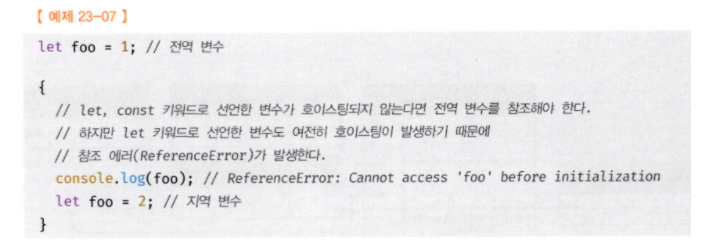 - let ,const 로 선언한 변수도 변수 호이스팅이 발생한다 단 let,const 로 선언한 변수는 런타임에 컨트롤이 변수선언문에 도달전까지 일시적 사각지대에 빠지기때문에 참조불가하다